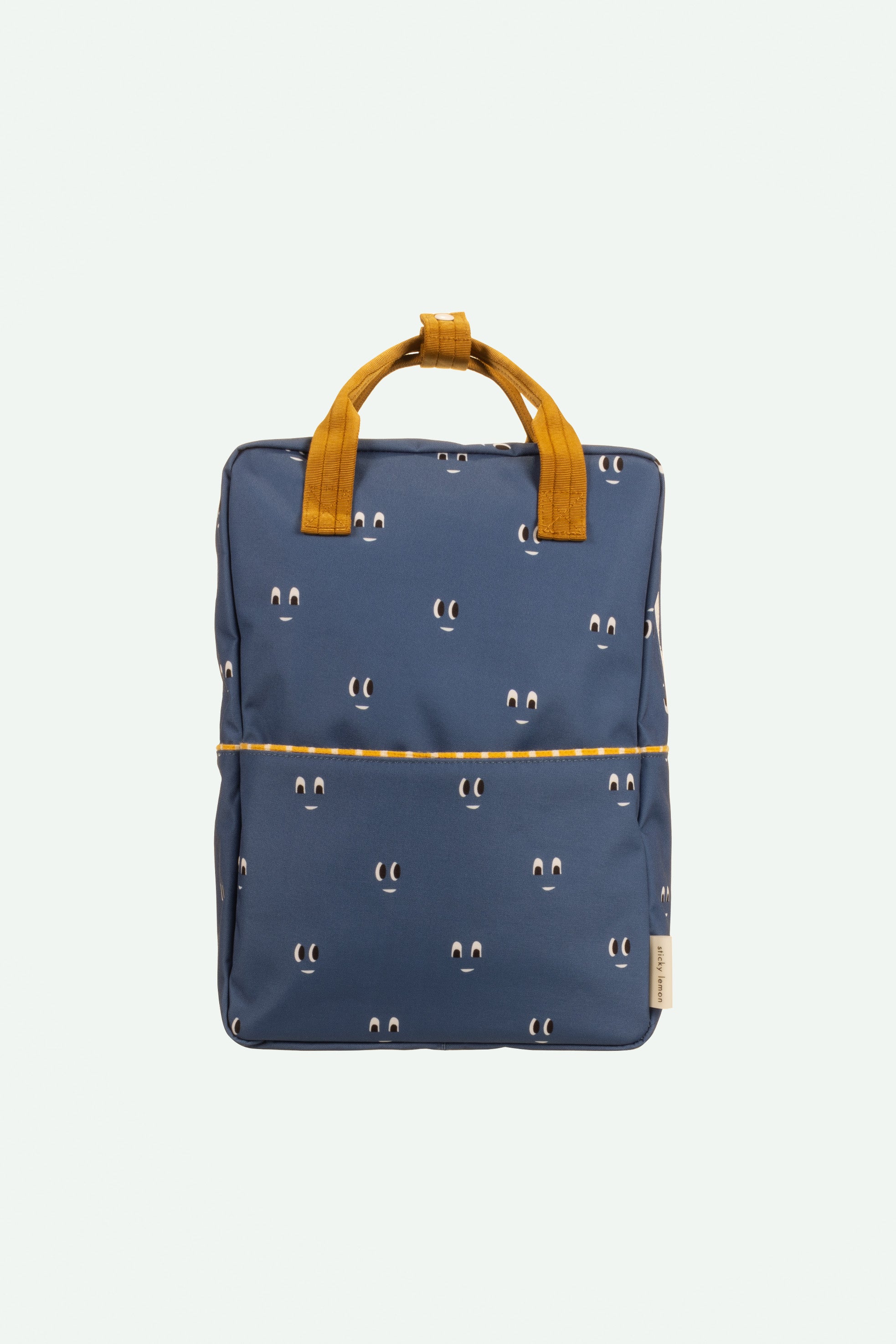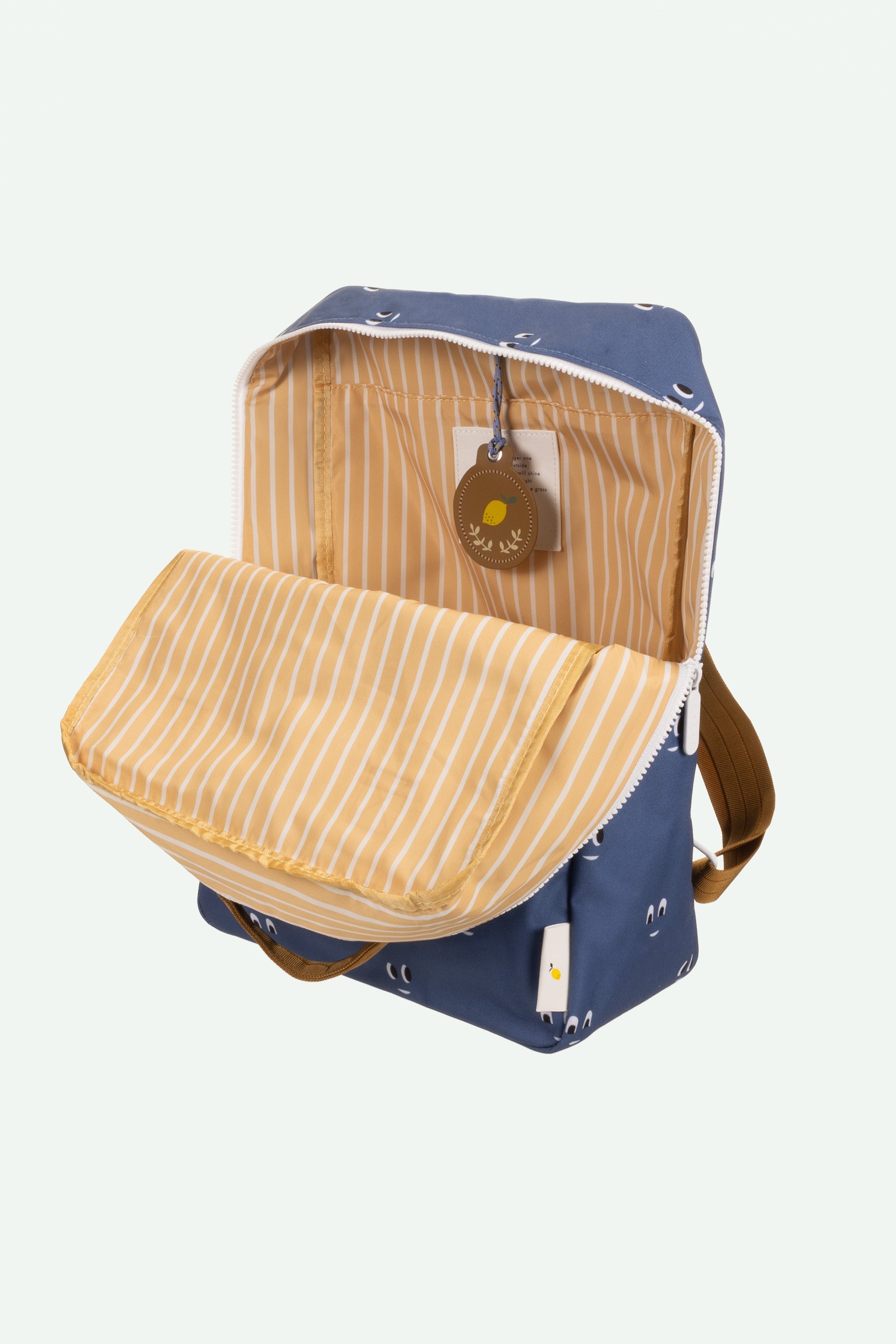 I spy with my little eye… A super fun large backpack with eyes all-over! It comes in boxing blue and has golden cup coloured, adjustable handles. The backpack’s made from recycled PET bottles, yay for that! It has a hidden front pocket and you’ll find another, bigger pocket on the inside that closes with velcro. It comes with a waterproof lining and has high-quality YKK zippers. Write your name and contact details on the name tag that comes with the bag, to make sure it returns home safely in case you’ve lost it. And another handy detail, the backpack has an elastic band on the inside, to keep your bottles and cups right in place.