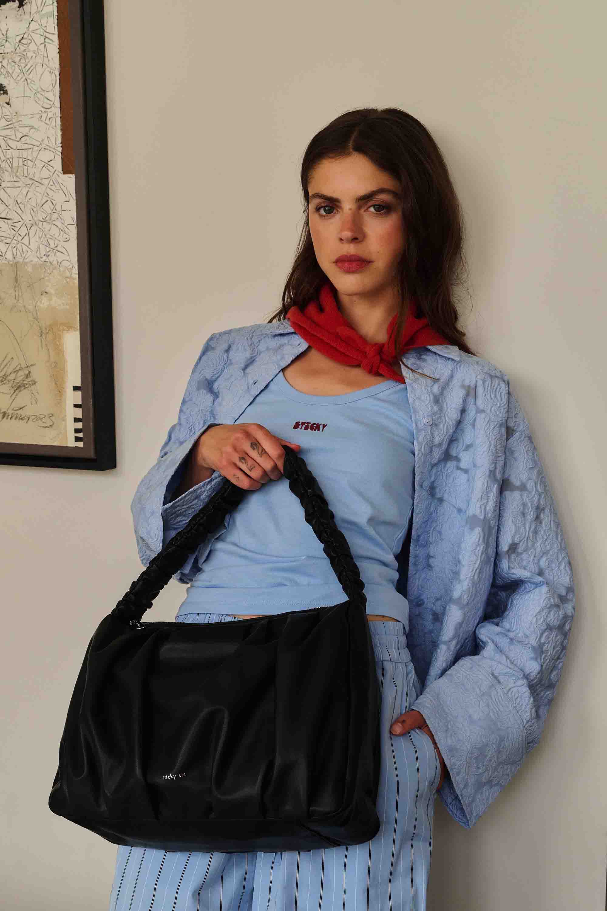 A new addition to our collection: a pleated hand bag that makes every outfit sophisticated! The lining has polkadot printing for a fun touch.