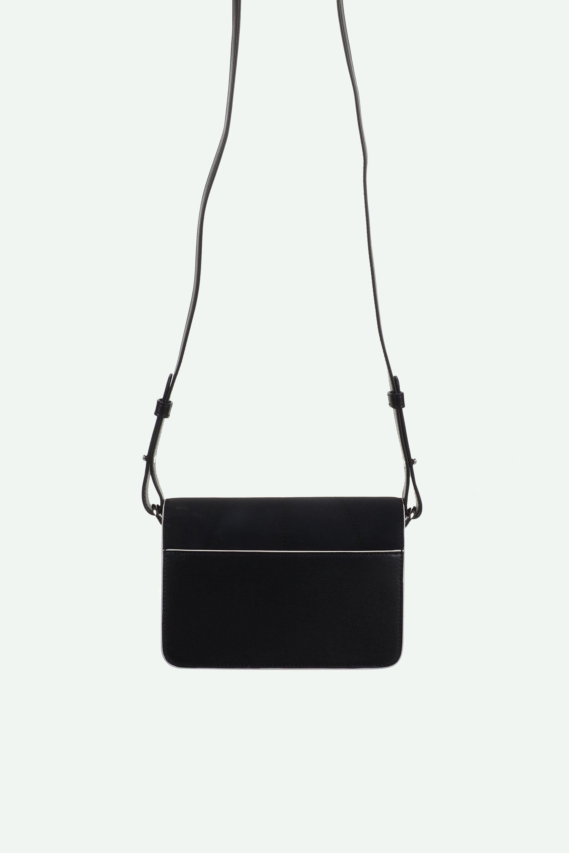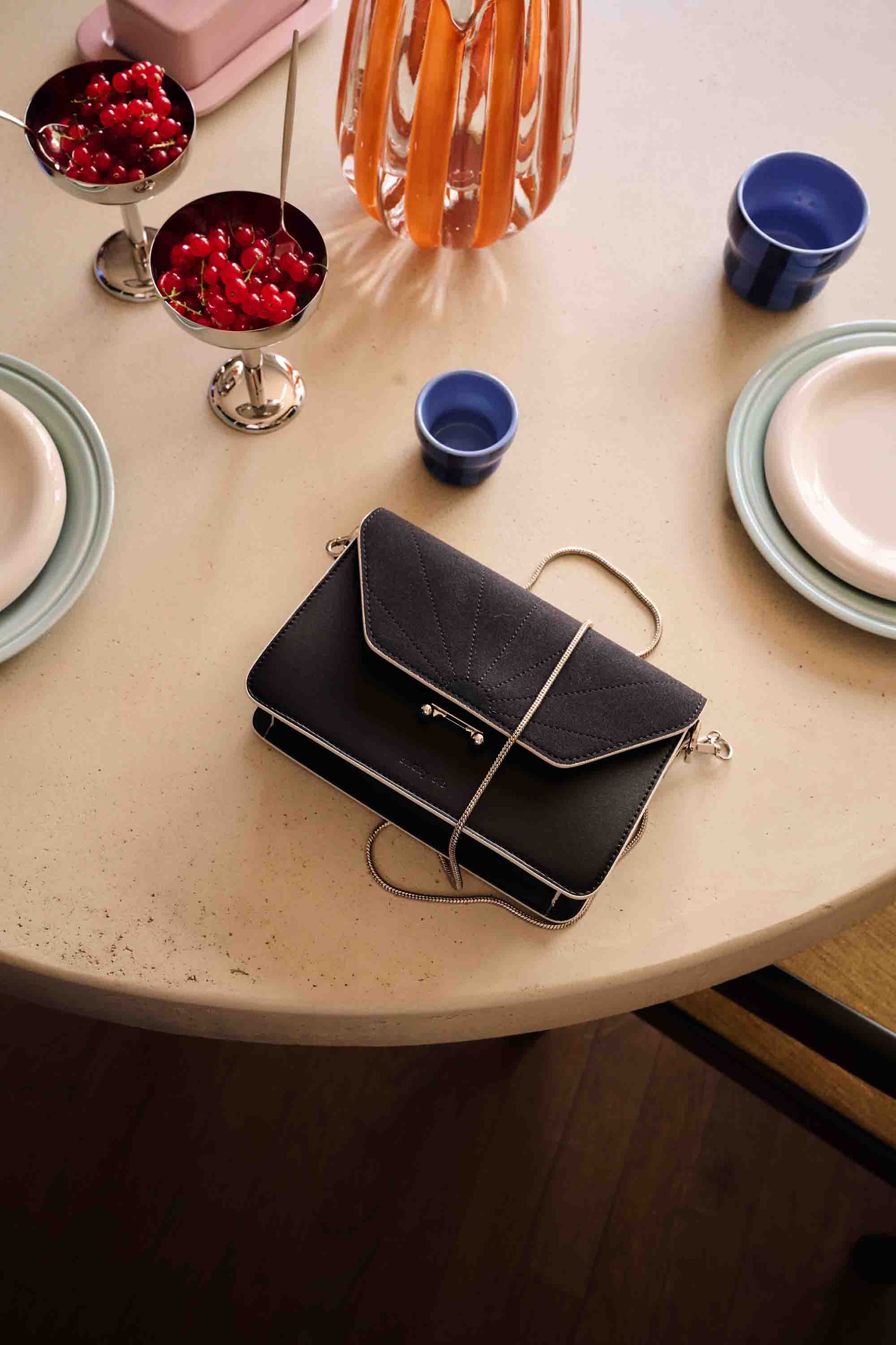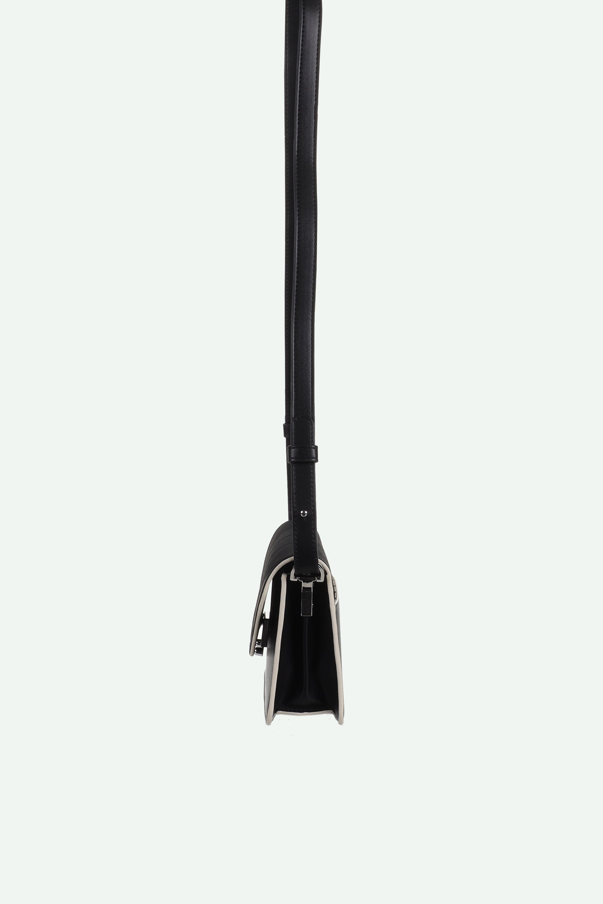 A classic black shoulder bag with white details and two different, detachable handles: an adjustable vegan leather strap and a golden snake chain. It's up to you! Going for a laid-back, casual or a super chic look?